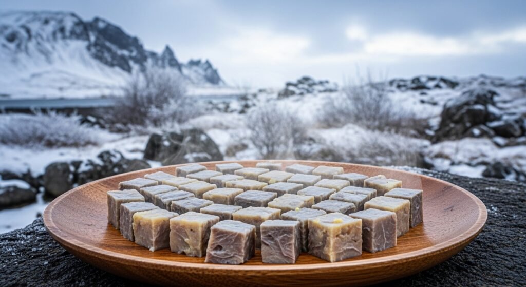 This old dish from Iceland is made of shark meat that sits for months. People eat it mostly when the weather gets cold outside. It smells like a harsh chemical cleaners and that might scare you. You only need a small bite to try it.