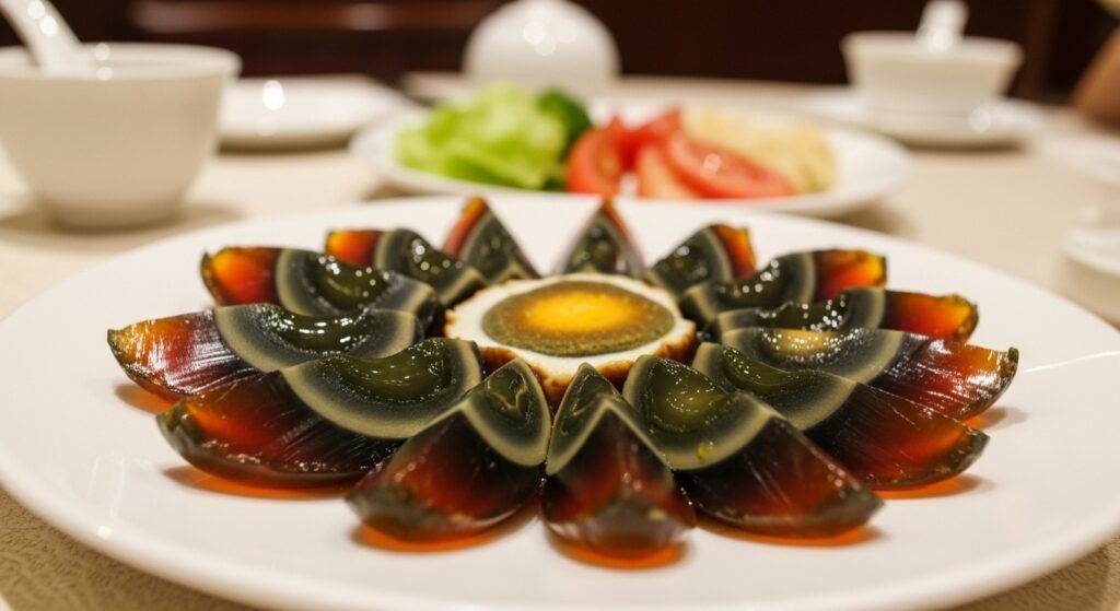 These eggs are preserved for several weeks or months in a mixture of clay and ash which changes their internal color drastically. The yolk turns a dark green or grey color with a creamy texture while the white part becomes a dark brown translucent jelly with a salty flavor.