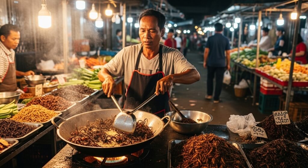 Some towns in Cambodia sell big fried spiders as a popular local snack for people to eat. Travelers often feel very surprised because these bugs are quite large and look scary. The cooks use garlic and sugar to make them taste much better.
