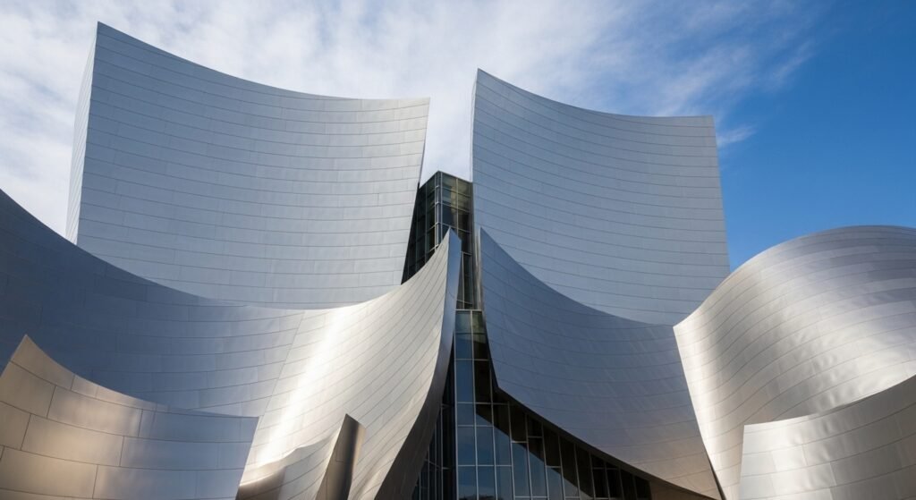 So you have to see this place in LA because it is just wild looking. The whole outside is covered in bright silver metal that curves around like big boat sails. It looks cool but it also makes the music inside sound amazing.