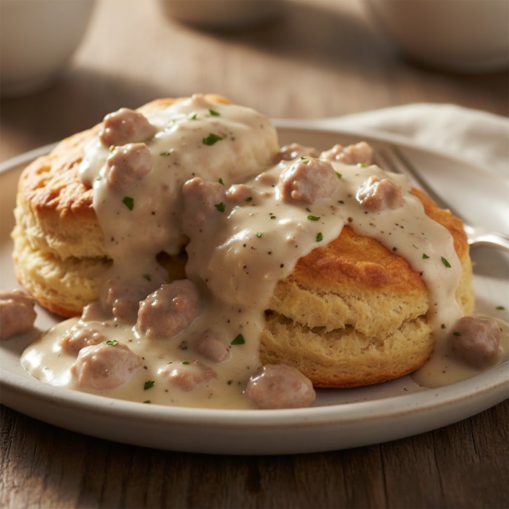 American biscuits are not cookies, but rather soft little rolls. They’re topped with white gravy that’s mixed with meat fat and flour. To folks familiar with sweet biscuits, it’s a dense thing that confuses many when you’re making breakfast.