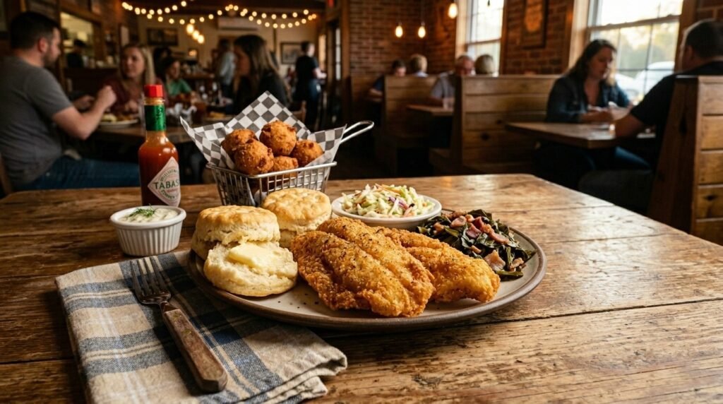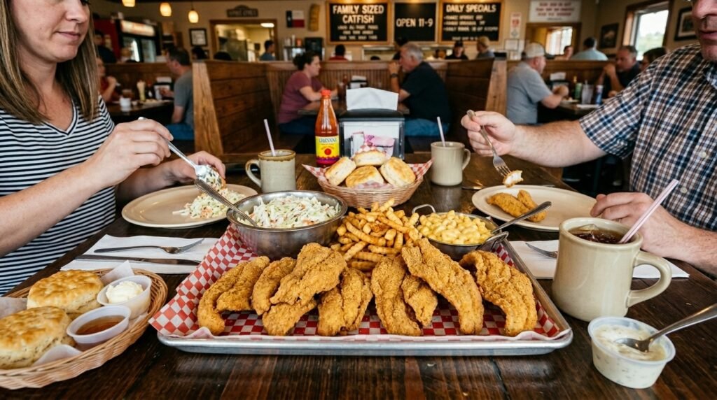 They have this crazy generous Friday Fish Fry with four hand battered cod fillets and biscuits or you can just get the regular farm raised catfish plate any day of the week. I think the portion sizes are totally out of control in a good way because they hook you up with multiple sides and hushpuppies so you get your money worth.