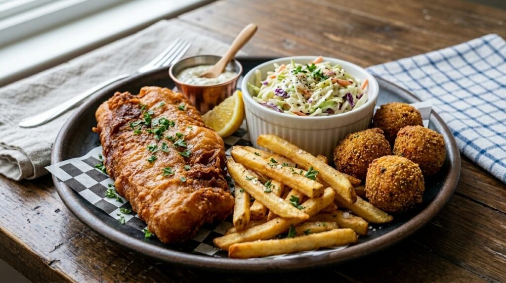 Getting a huge plate of fish is awesome but having the right sides like crispy fries and creamy coleslaw really completes the whole dining experience. Some people might prefer different things but those classic additions help balance out the heavy crunch of the fried fish fillets perfectly.