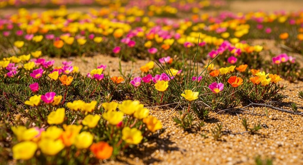 This plant grows low and creates a thick carpet of bright flowers. It loves sandy ground where water is hard to find. While other flowers might dry up and die, this one stays strong. It actually likes the heat and dry soil.