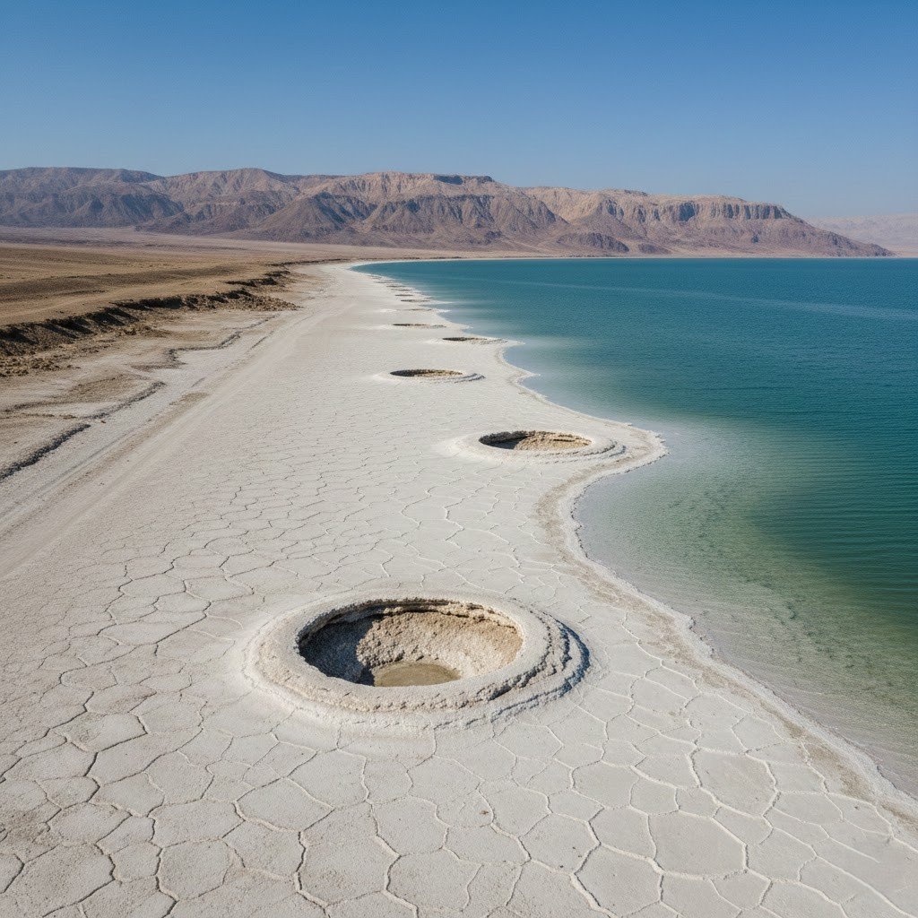 Because the water level is getting reduced every year in the Dead Sea, it is getting smaller and smaller. You can see sinkholes and dry land around the edges of the Dead Sea now and is really being affected by this.