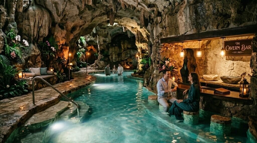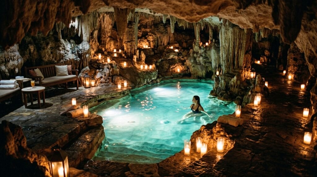 This place is wild because it actually has an underground saline pool hidden inside a candlelit cave. I spent a good amount of time just soaking down there, but the regular outdoor pool area and gardens are also incredibly chill and relaxing.