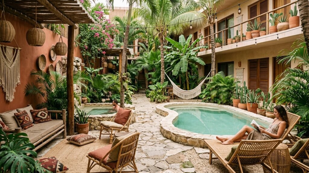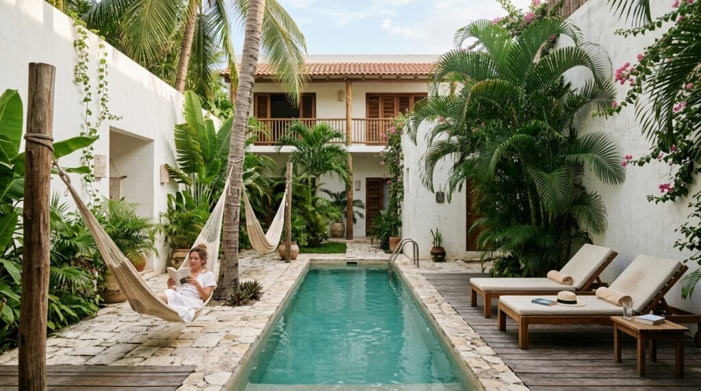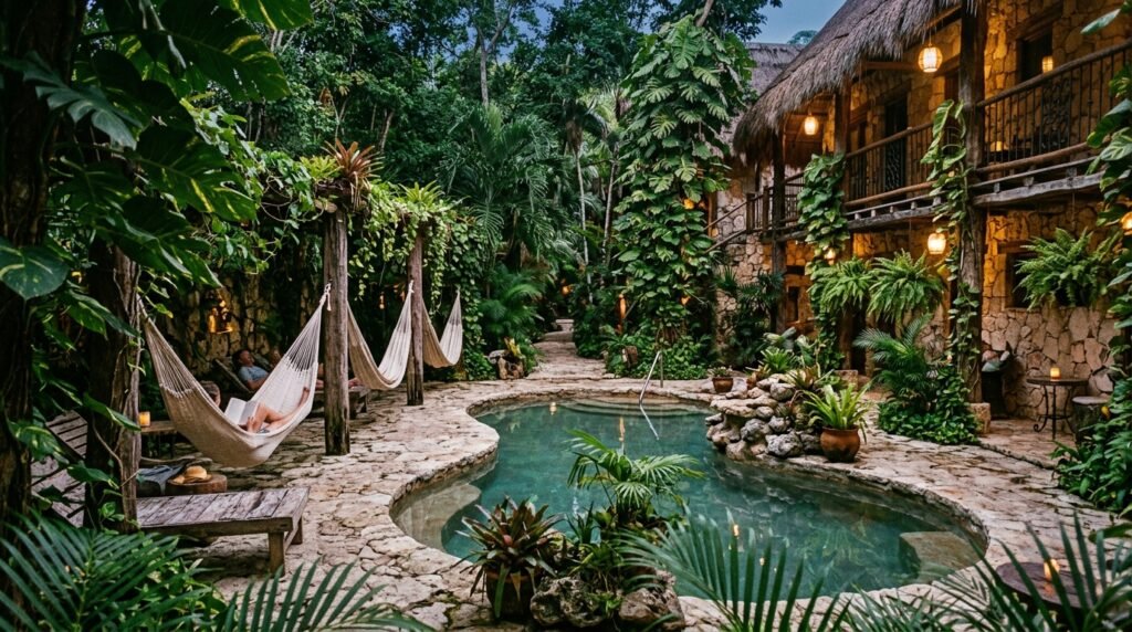 This place genuinely feels like stepping into a hidden jungle courtyard with all the vines and hammocks set up around the pool. It is located right near the market and a famous cenote, so it made exploring the town super easy and convenient for me.