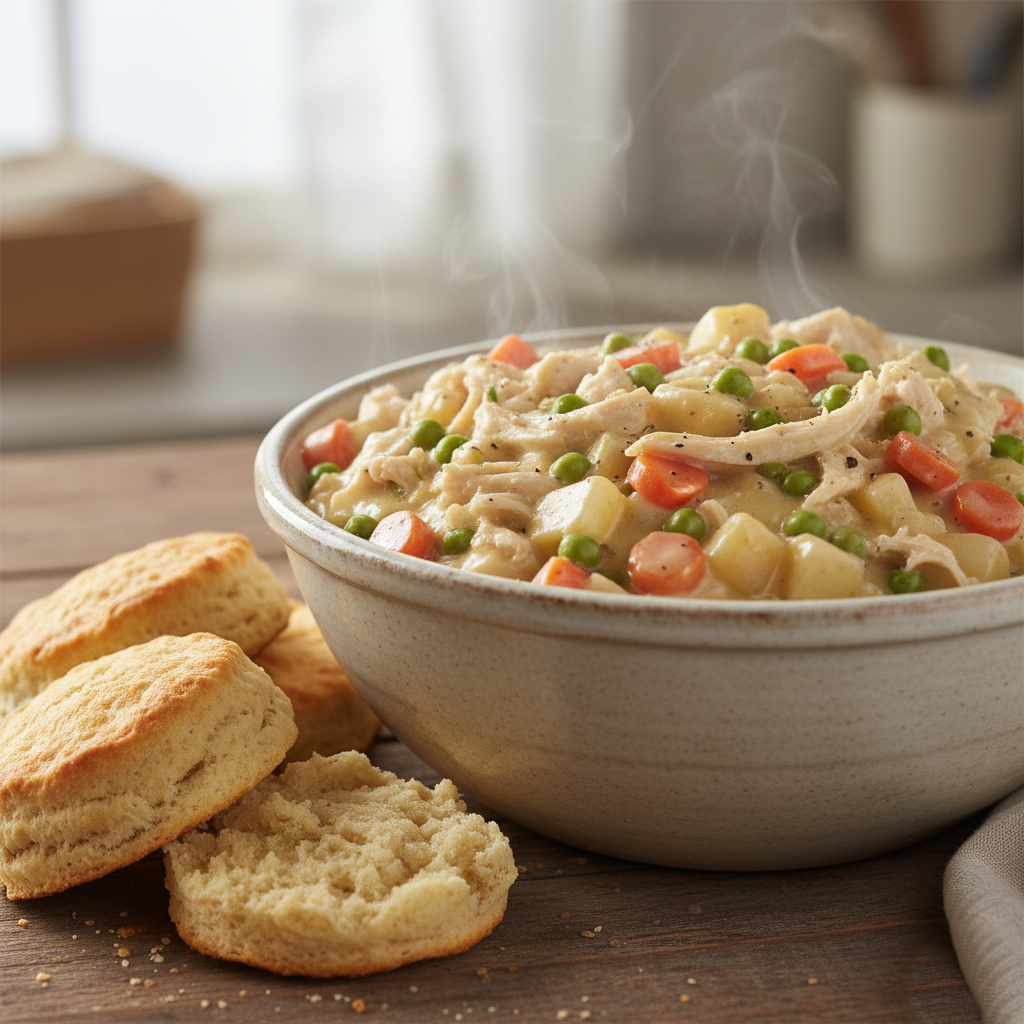 All the comforting flavors of funk pot pie without the roaster. A mixture of vegetables when blended with chicken gives a delicate sauce which is quite tender in taste. And when served with biscuits it brings out a delicious taste on a whole.