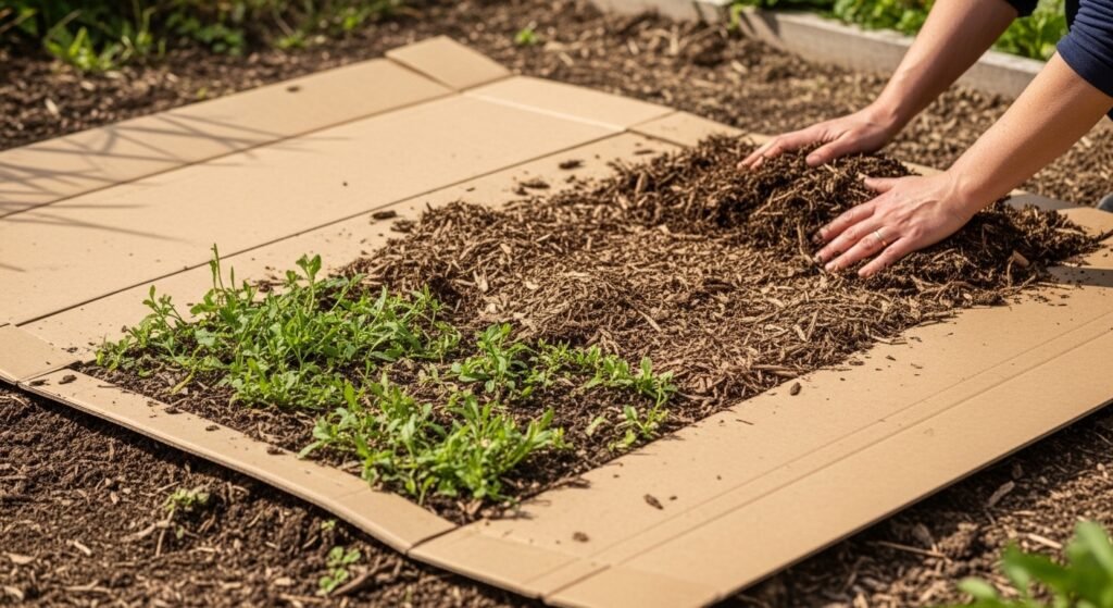 Create a layer of compost or mulch over the weeds and a cardboard (flat) is placed on the weeds. This prevents the sunlight and the weeds fail to grow but the cardboard is slowly ruined.