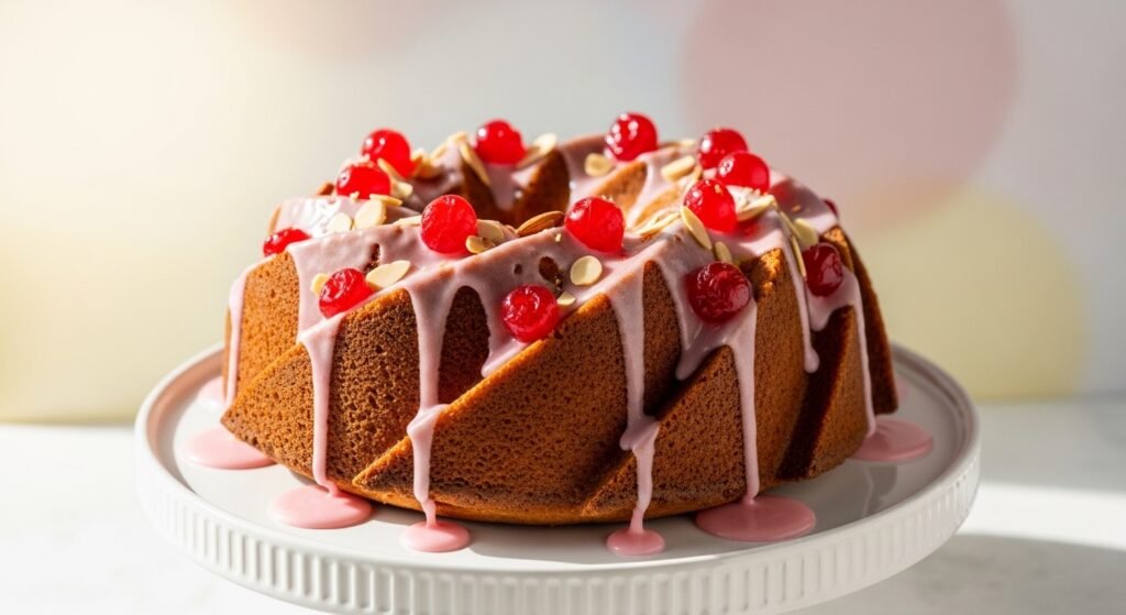 This sweet cake tastes like cherries and nuts which is a classic mix everyone loves to eat. It looks amazing on a plate because of the bright colors. You probably saw this treat at big family parties or lunches when you were a kid at home. It stays simple.