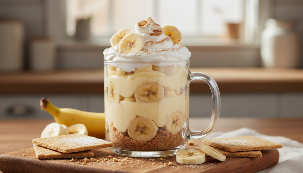 Folded or sliced bananas cast into vanilla pudding-like stuff can be cooked in the microwave. This mug pie is creamy, soothing, and even quite nostalgic, and it is finished with cookie crumbs or whipped topping.