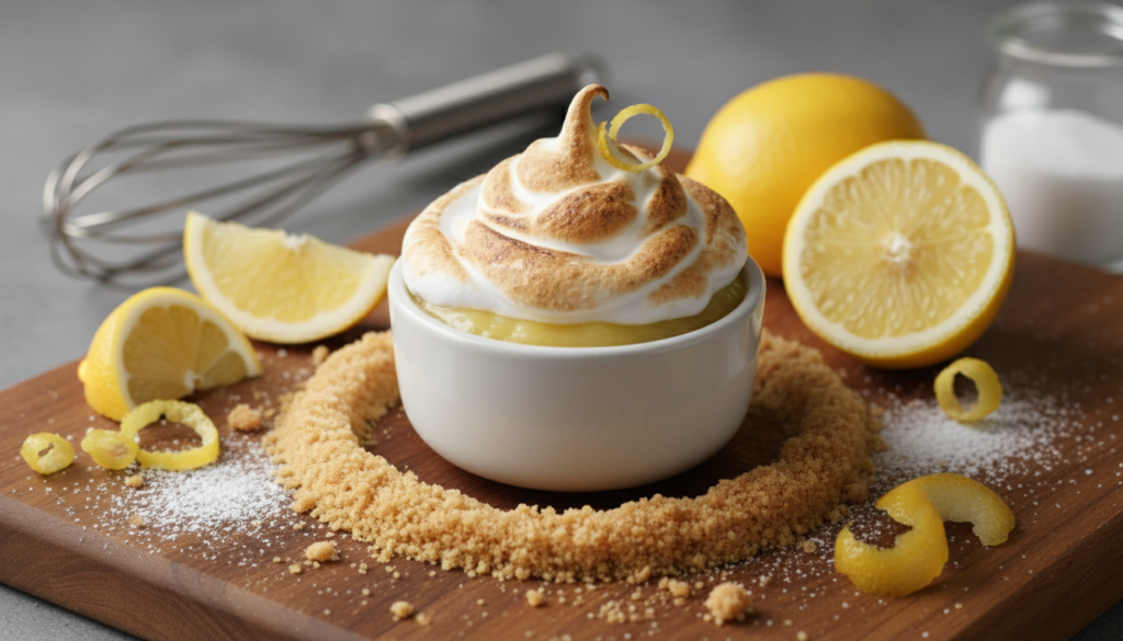 A speedy lemon filling consists of juice, milk and sugar which when heated becomes tangy and creamy. It is also topped with marshmallow fluff or whipped cream, which makes it capture the essence of lemon meringue without complicated procedures.
