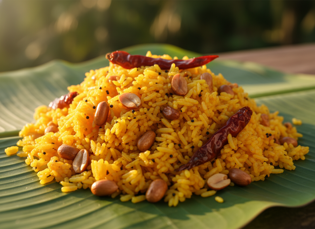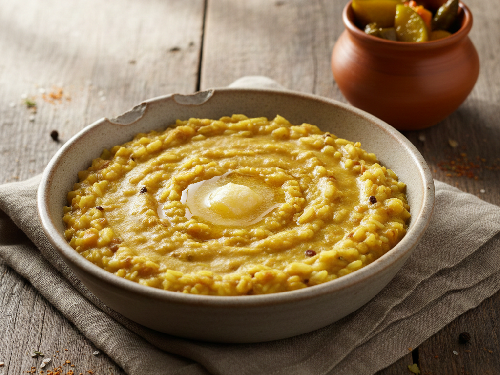 Simmered soft rice with lentils, combined with light spices produced a nutritive dish that was also very soft. It was served with a spoon of clarified butter and plain side dishes, which made it warm and comforting in the evening to those nights when comfort was required.