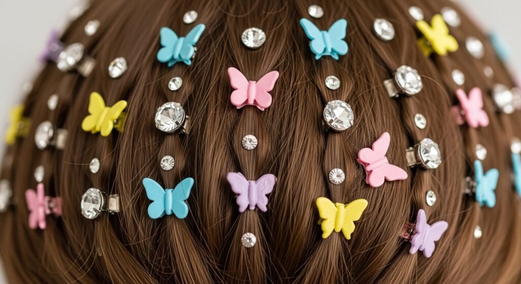 Little plastic butterfly clips and stick on rhinestone gems are decorating hairstyles once again. They add a playful and very youthful energy to any basic hairdo.