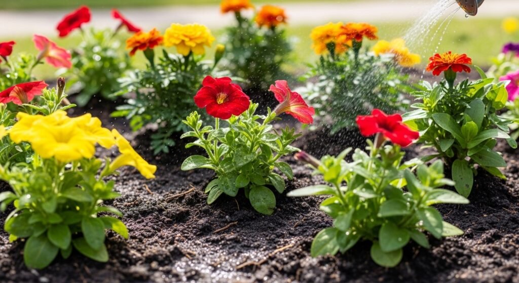 Newly planted flowers need a steady drink to help them grow. You want the soil to be soft and damp for a while. Once they are established they become very strong. You can stop worrying about them so much during the hot summer months.