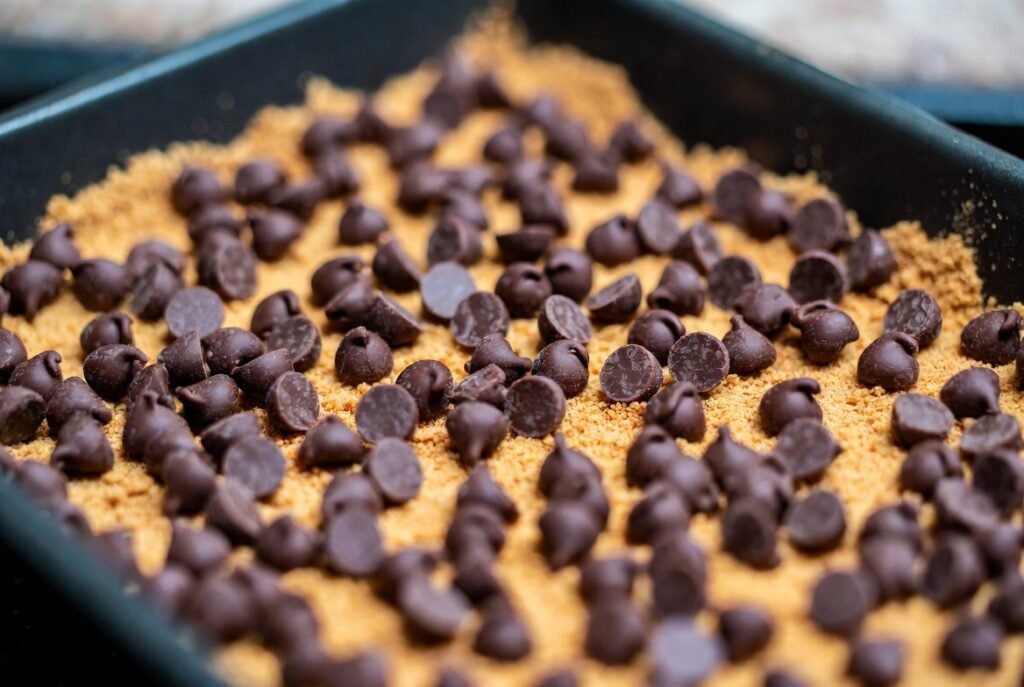 Chocolate chips, semi-sweet, and sprinkled evenly on the top of the crust so that there is no bare space. The chips melt during the baking of the bars to create creamy molten pockets of chocolate flavor in the dessert. It is also delicately sweet and rich in flavor and does not dominate the other ingredients.