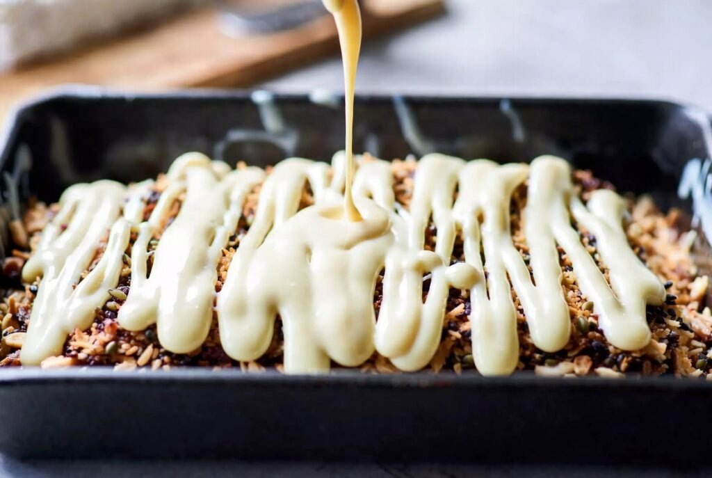 The sweetened condensed milk may be drizzled over the whole surface gradually with the intention of making it even. This ingredient contains all the layers and bakes into cracks and creates the typical sticky texture.