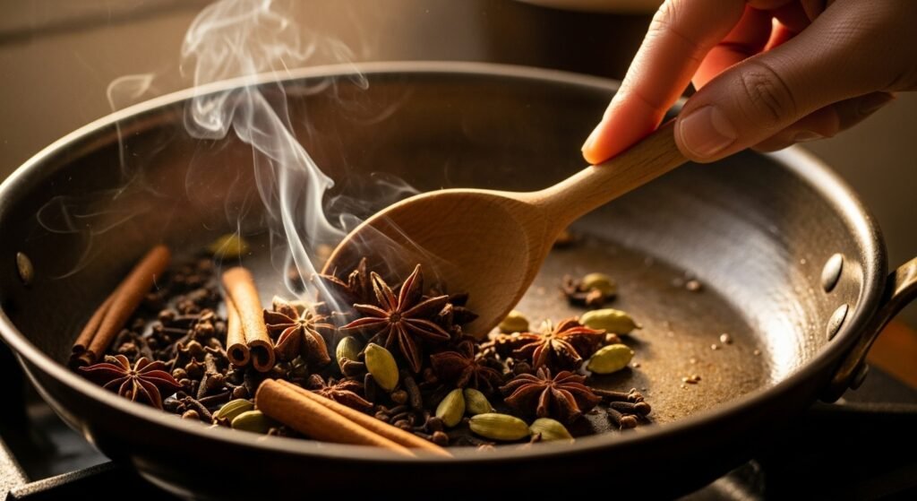 Heating spices for a short time releases their oils. This makes the scent much stronger and helps the taste of your food. It is a basic step that many people use to get better results. You can easily do this in a few minutes.