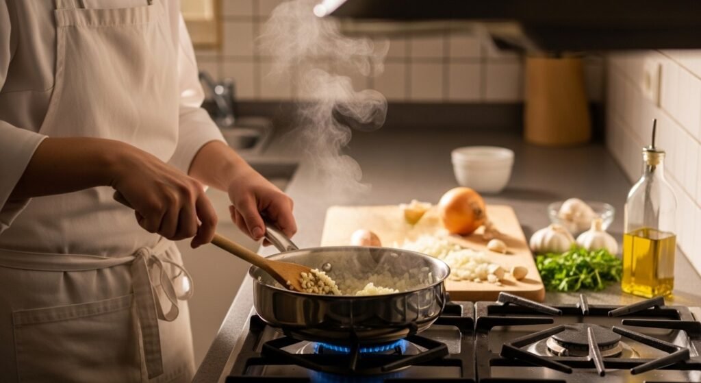 Begin with butter, finely chopped onions, and garlic. Brown to a tender and tender base. This is the procedure of adding texture prior to the incorporation of the primary constituents.