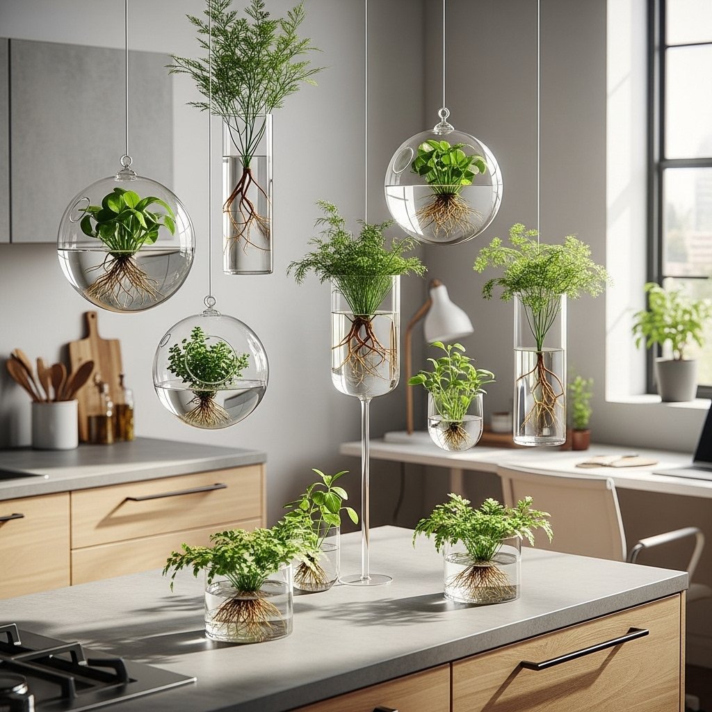 Floating plants are best suited in places that are too sharp and structured. They are appreciated in kitchens, bathrooms, or workspaces. The visual softening of the edges by the plants does not occupy counter space.