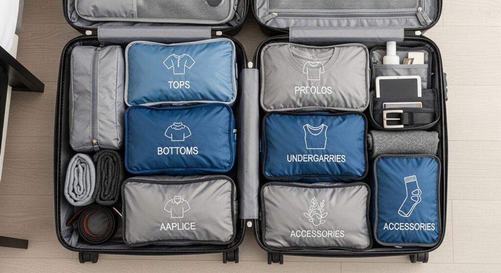 These are small fabric containers that help you organize different types of clothing inside your main bag. They compress your clothes together and make finding specific items much faster.