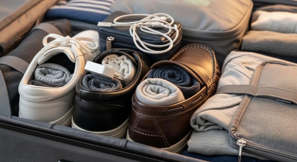 Stuff socks and smaller socks into your packed shoes so you are not wasting that little bit of empty space. Every small gap inside your suitcase should be filled with something useful.