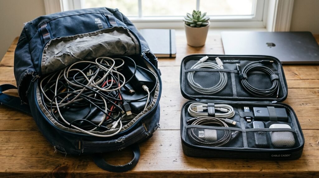 Throwing all your chargers into one big pocket guarantees you will be digging around for ten minutes. A dedicated compact cord organizer keeps every single wire and plug exactly where it belongs.