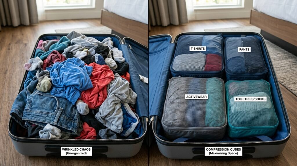 Just shoving all your folded clothes into a suitcase is a recipe for wrinkles and total chaos. Using compression packing cubes squishes everything down and keeps your clean clothes away from your shoes.
