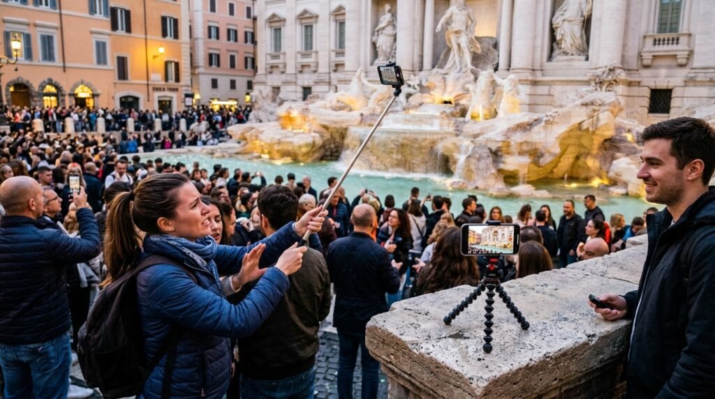 Selfie sticks are honestly just annoying to carry around and use in crowded tourist spots. A compact travel tripod is much better because it holds your phone steady for pictures and watching movies.