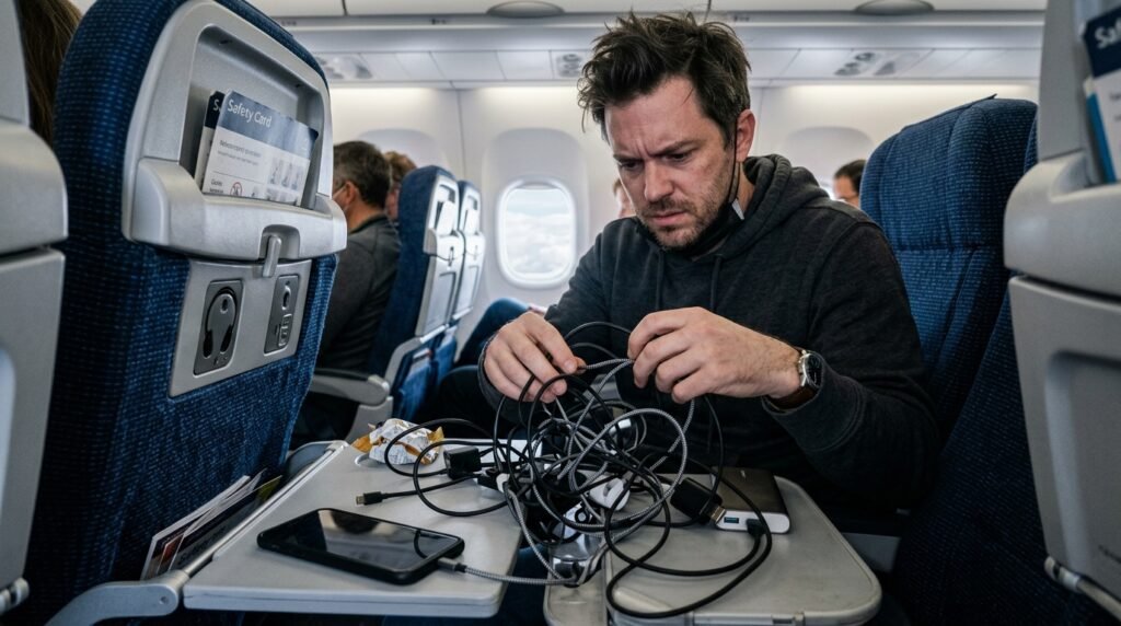 Sitting in a tangled mess of different wires in a tiny airplane seat is the absolute worst. Bringing just one multi charging cable that handles all your devices keeps things nice and tidy.