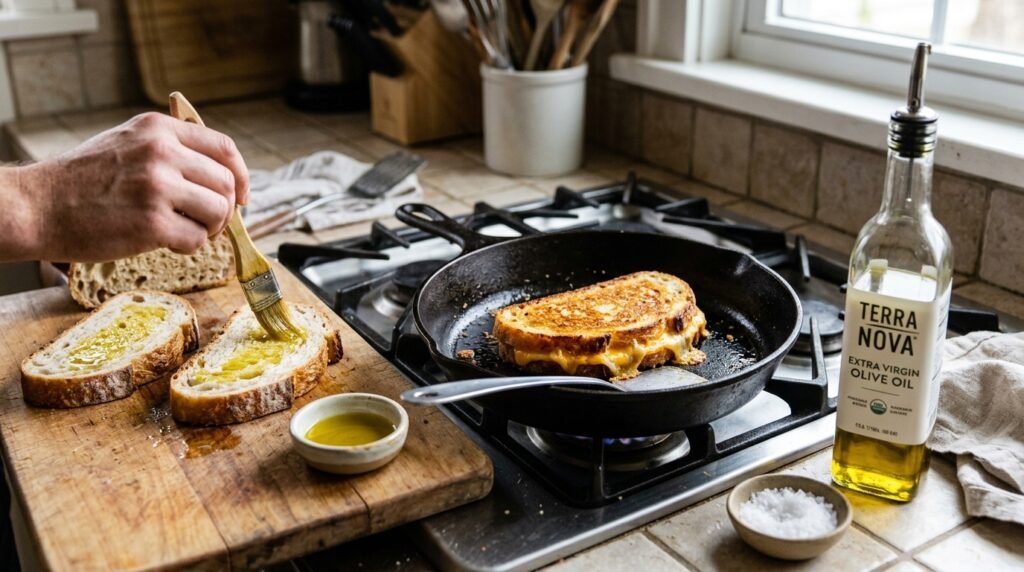 I brushed some olive oil on the bread and it gave the sandwich a really loud crunch when I bit into it. The problem is that the fruity flavor of the oil was way too strong and totally overpowered the simple cheese inside.
