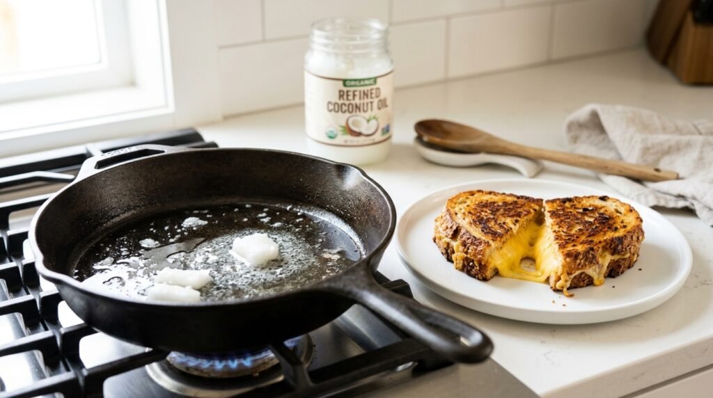 This was the biggest shock of the whole experiment because refined coconut oil made the absolute crispiest crust out of all the methods. The flavor is totally neutral so it lets the cheese be the star of the show while giving you that crazy crunch.