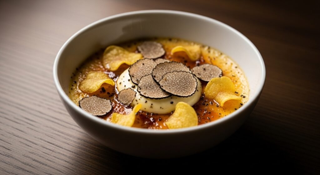 The waiter brought this thick egg custard with truffles and chips. I really did not know how to eat it at first. It was just way too heavy. They were definitely trying way too hard to act super fancy for no real reason here.