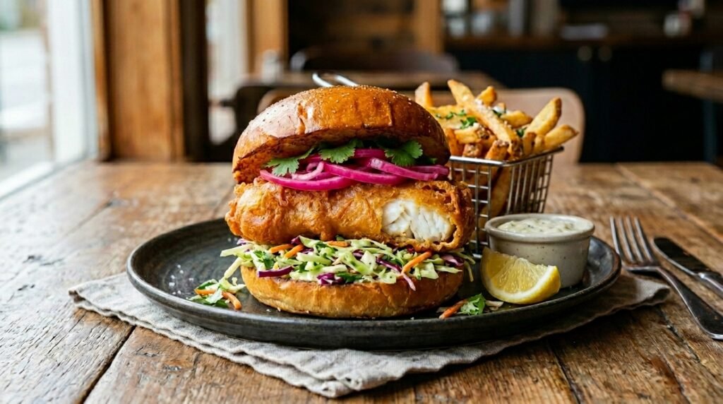 Habit Burger drops this limited time sandwich and it comes with pickled red onions and a cilantro lime coleslaw that makes it feel super fancy. The juice battered cod is super crunchy and those fresh toppings really make it pop if you are looking for something different.