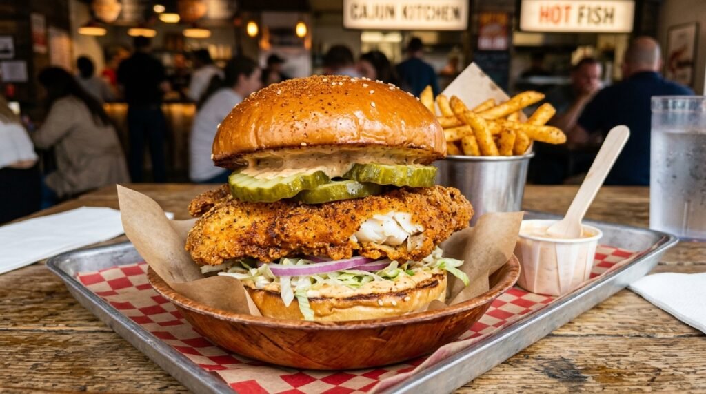 This one stands out because they use flounder instead of the usual pollock and it comes with that famous spicy cajun seasoning that Popeyes is known for. The buttery brioche bun and the thick pickles give it a really nice crunch but it might be a little too spicy for some folks.