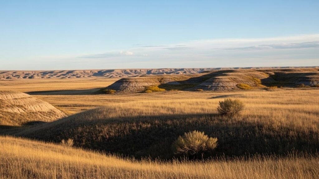 Explore a fall landscape filled with small hills and wide prairie. The calm setting may allow easy walks, photos, and moments of stillness, as the land opens out and sounds fade across the empty ground.