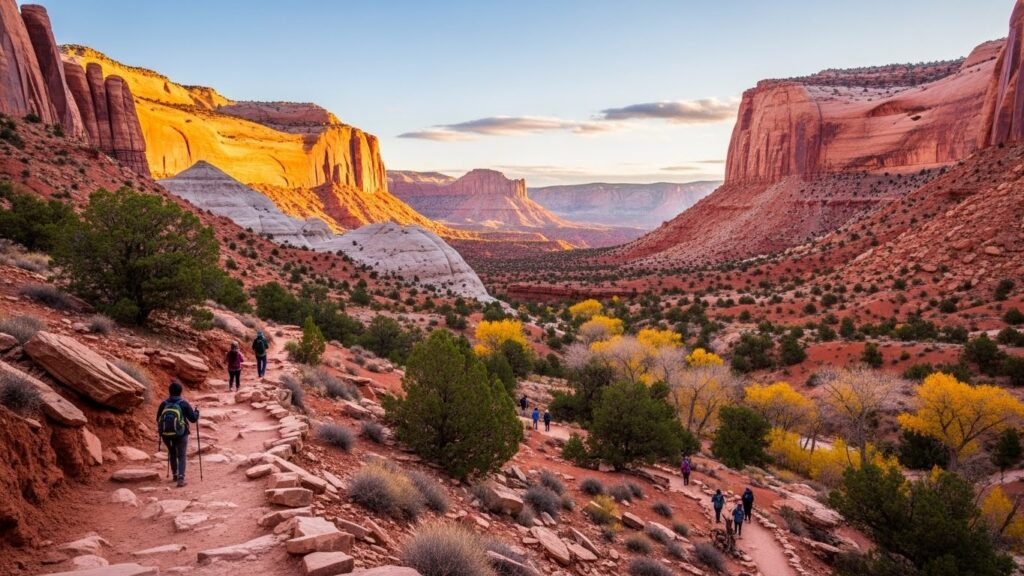 In fall, Capitol Reef in Utah can feel less busy. Red cliffs may catch soft light from the sky. You can hike Cohab Canyon, where trails may stay open and give space to walk around.