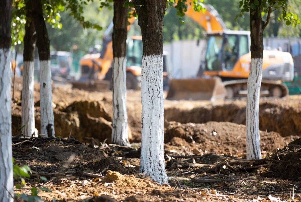 The trees near the construction sites are at times marked to show that they must be conserved. The white paint warns workers against cutting or taking equipment closer or disturbing roots. Earth moving machinery can step on soil crushing root systems.