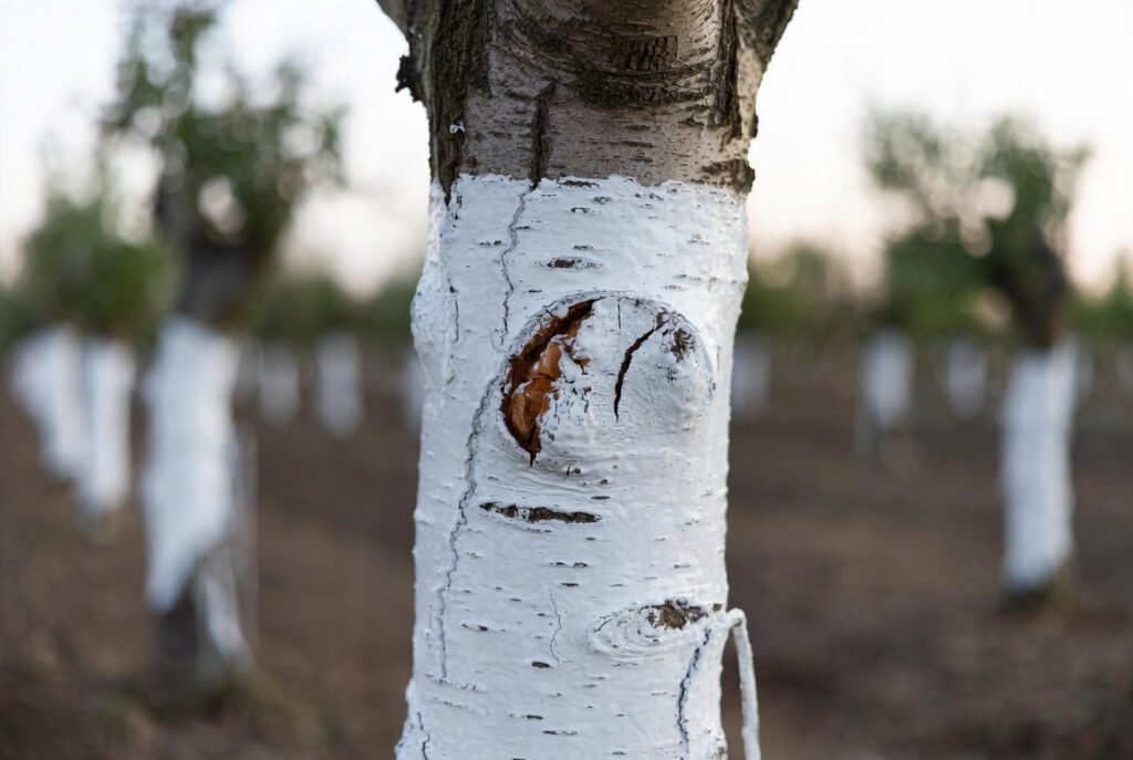 The fungi and bacteria may enter them through cracks and incisions or via the weak bark areas. Minor wounds can be coated with protective white coating which avoids the development of infections. This is part of the normal tree maintenance in the orchards.