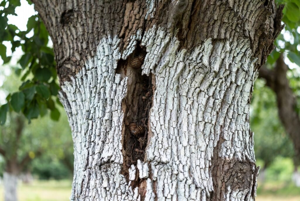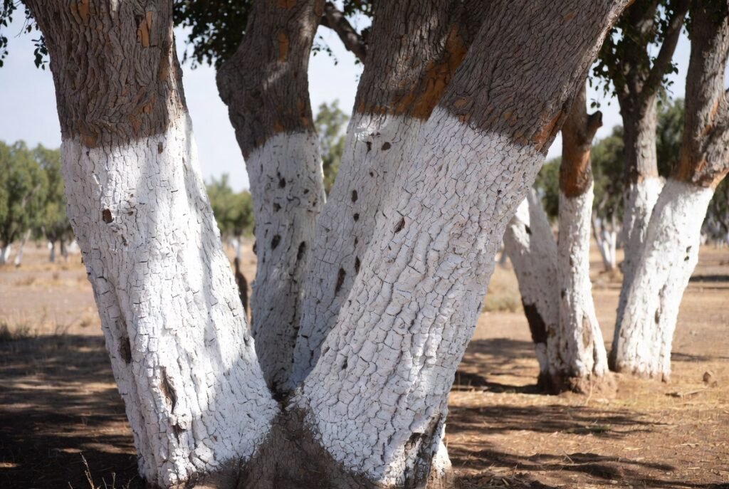 White paint is applied to regulate the trunk temperatures other than the sunburn. Day and night may have sudden increases and decreases in temperature which cause the barks to be split.