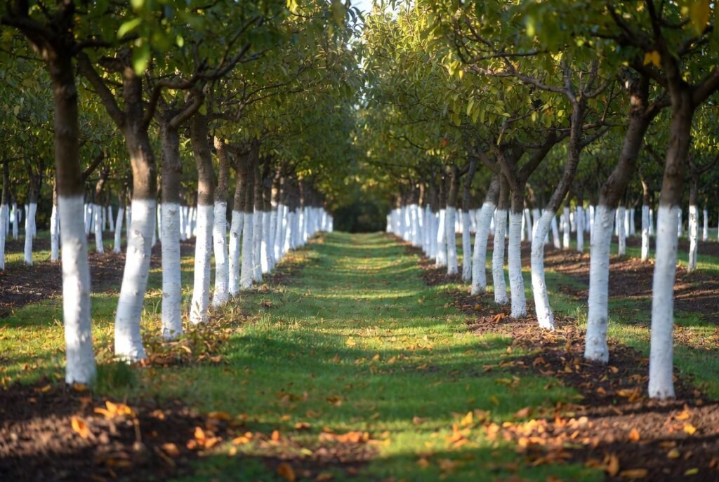 During the routine care, a farmer might paint the trunks by fruit growers. It may be made of a mixture of latex and water paint or lime wash. The goal is the overall health of the trees: to reduce the amount of pests, prevent sunburn, and improve the life cycle.