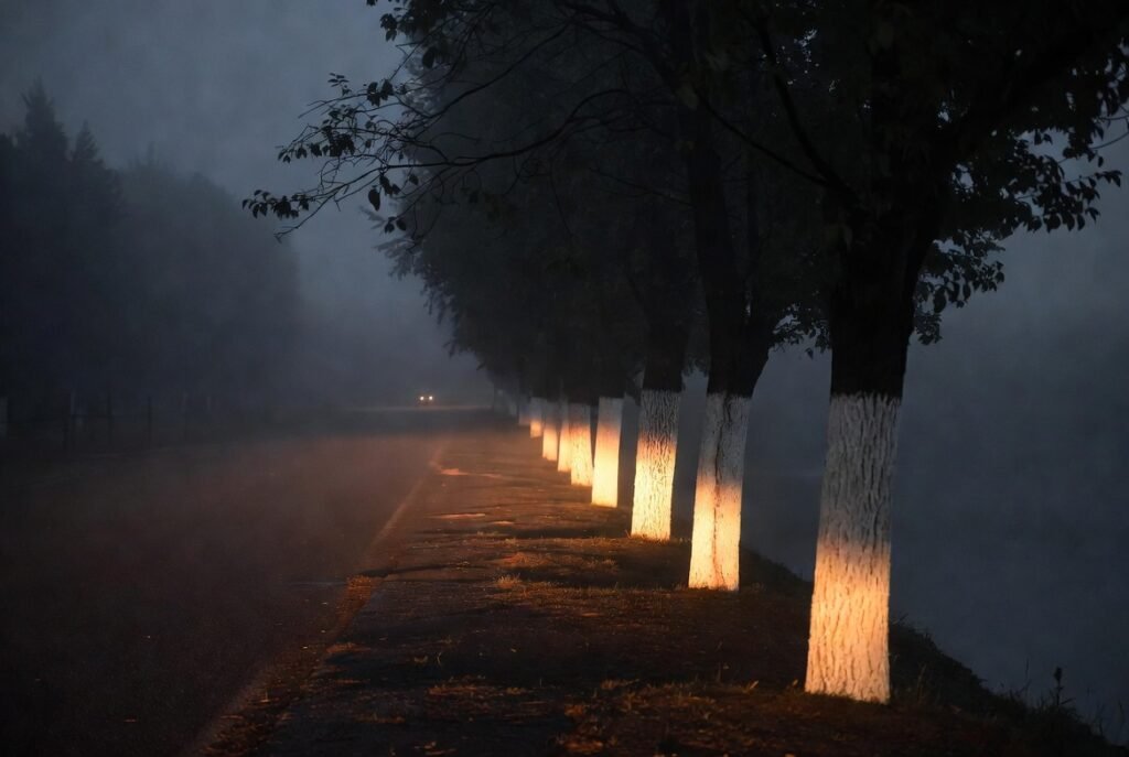 Sometimes trees painted along the roads are utilized as a visibility aid. During the night the headlights are reflected on white, thereby making the sides of the roads more visible in the dim light or fog.