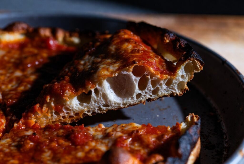 Transfer slices onto a metal spatula to leave the slice bottom crispy. Each bite promises Crunchy outside, airy crumb and richly cheesy taste. The Detroitstyle pizza can be recalled owing to the contrasting textures. Best had hot, and cheese pulled off.
