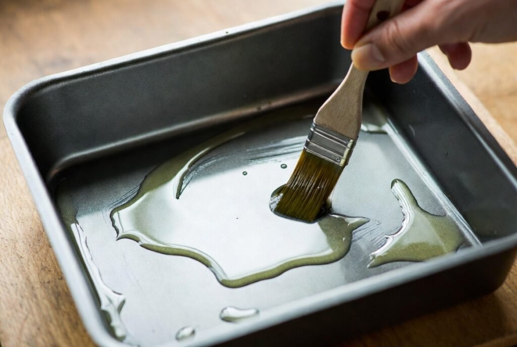 Grease a rectangular pan made of metals lightly with a lot of olive oil. This is the step that is the most important because the bottom and edges of the dough are virtually fried in the process of cooking. Good coverage of corners should be ensured to prevent sticking.