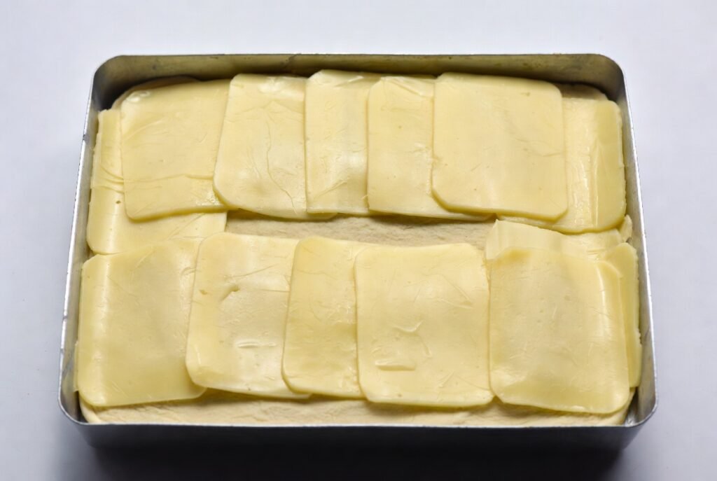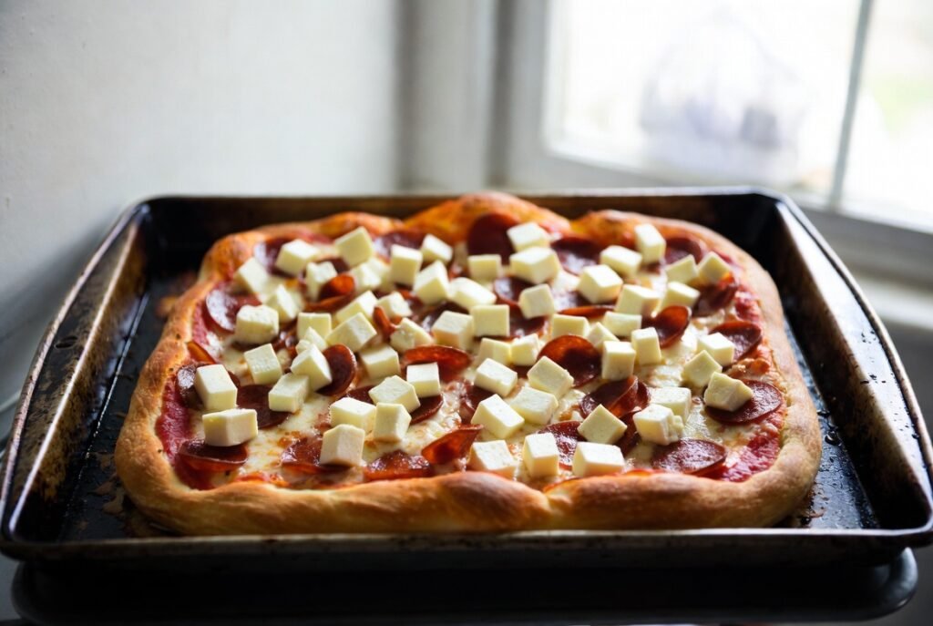 Cut squares or thick slices of mozzarella (or brick cheese) and put them directly on the dough, all the way to the edges. The cheese touching the walls of the pan caramelizes into crispy edges. Such a shift was typical of Detroit-style pizza.