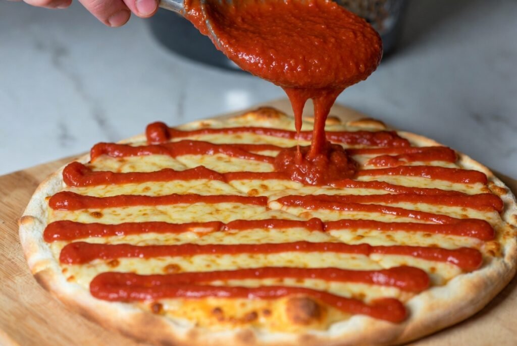 Sauce tomato should not be spread all over the top but in stripes. This vintage outlook leaves portions of the cheese exposed allowing it to brown. The sauce is also light and fresh because it is not over cooked.