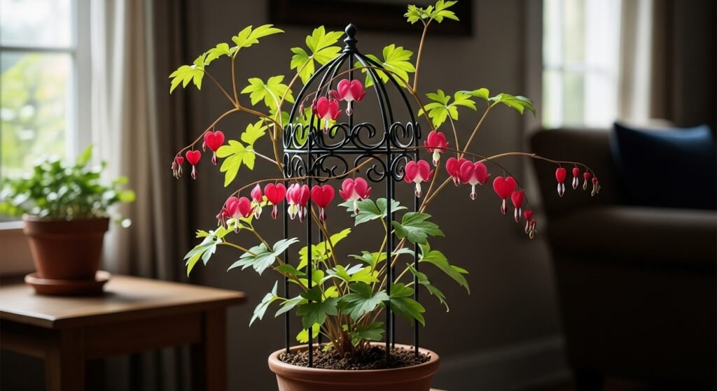 This unique plant has beautiful heart shaped flowers that dangle down and look very elegant. It grows best in partial shade and does not get too heavy so it works well on a small indoor trellis or a screen.