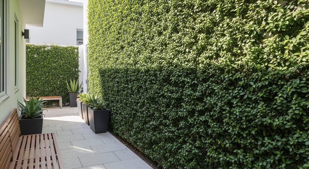 If you have a very thin gap between buildings or a small patio wall this plant is a really good choice. It has tiny leaves that lay flat against the surface and it creates a carpet of green without sticking out too far.