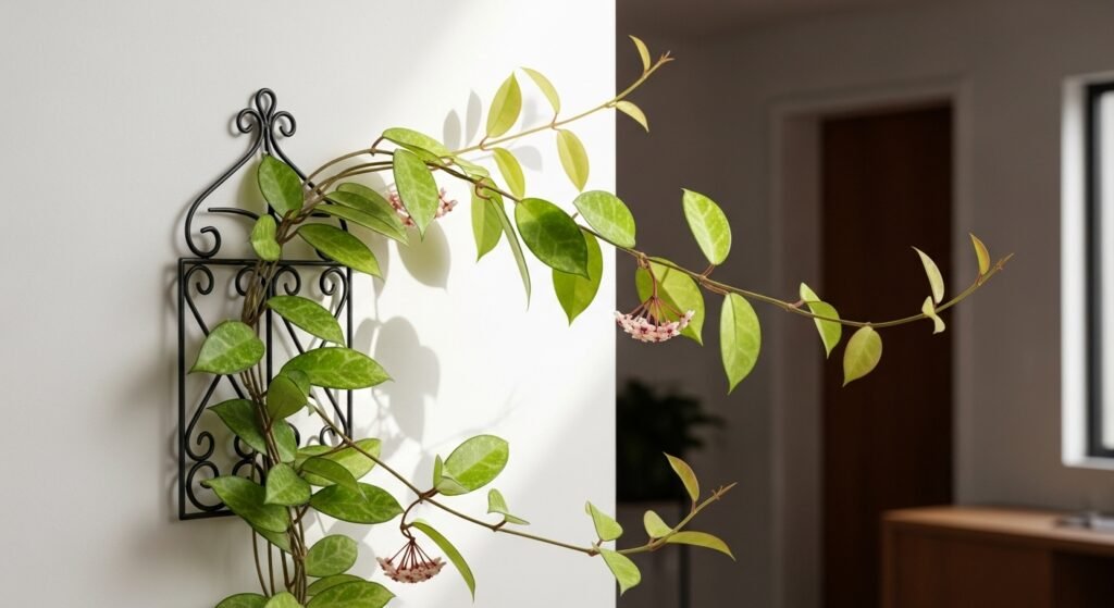 Hoya plants are excellent for indoor spots or small shaded porches because they have thick waxy leaves. They grow slowly and do not mind being in a smaller pot which makes them very easy to manage in a kitchen or office.
