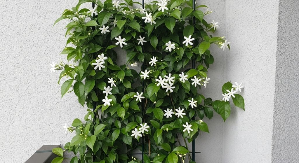 This one sticks around because it thrives up a trellis, filling the air with sweet white blooms. Green leaves stay put through every season, while its compact form makes tight spots no issue – just trim back whenever needed.